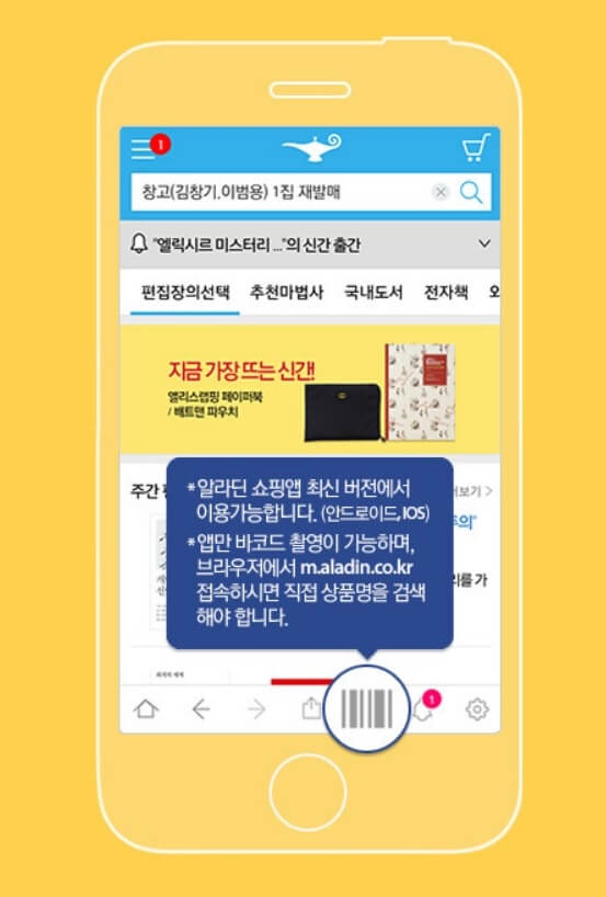 핸드폰에 알라딘 쇼핑앱을 설치하고 앱을 실행한 후 하단에 있는 바코드 아이콘을 클릭합니다. (바코드 촬영은 스마트폰 앱을 이용할 때만 가능하며 홈페이지에서 이용하실 때는 직접 상품명을 검색해야 합니다.) 이후 책 뒷면에 있는 바코드에 있는 숫자가 잘 보이게끔 스마트폰 카메라로 바코드를 인식해 줍니다.