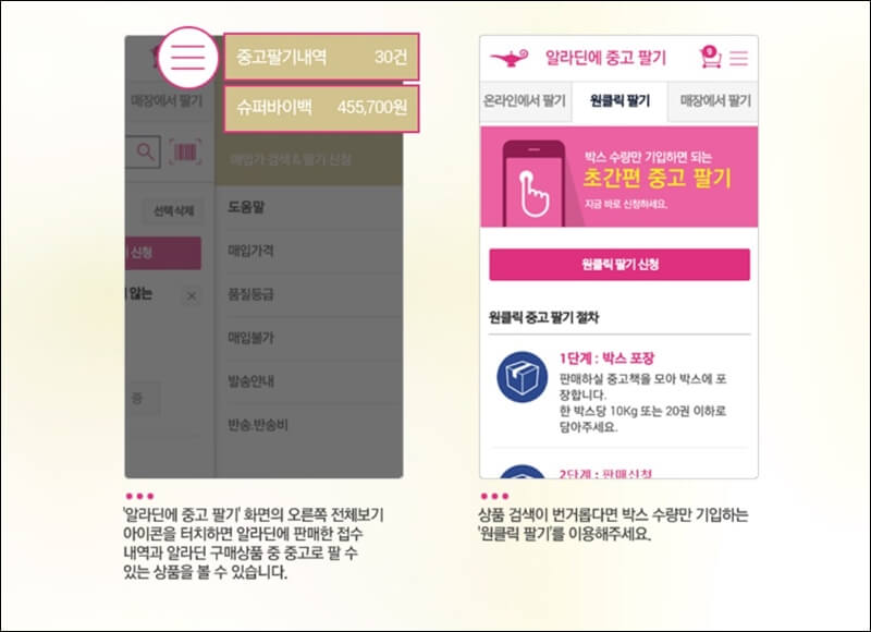 무엇보다 알라딘 중고서점을 이용한 책팔기는 스마트폰으로 거래가 가능하다는 장점이 있는데요~ 삼성폰뿐만 아니라 아이폰으로도 매입가격 검색부터 팔기신청까지 가능합니다.