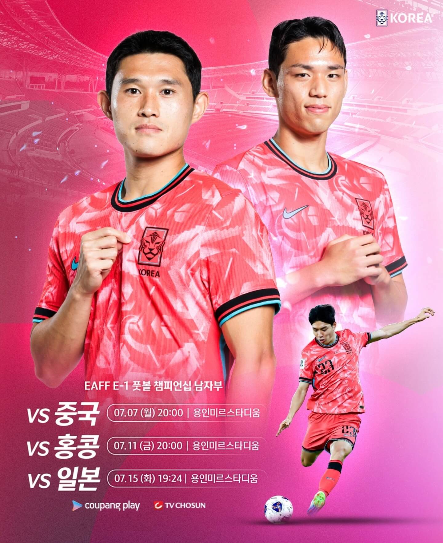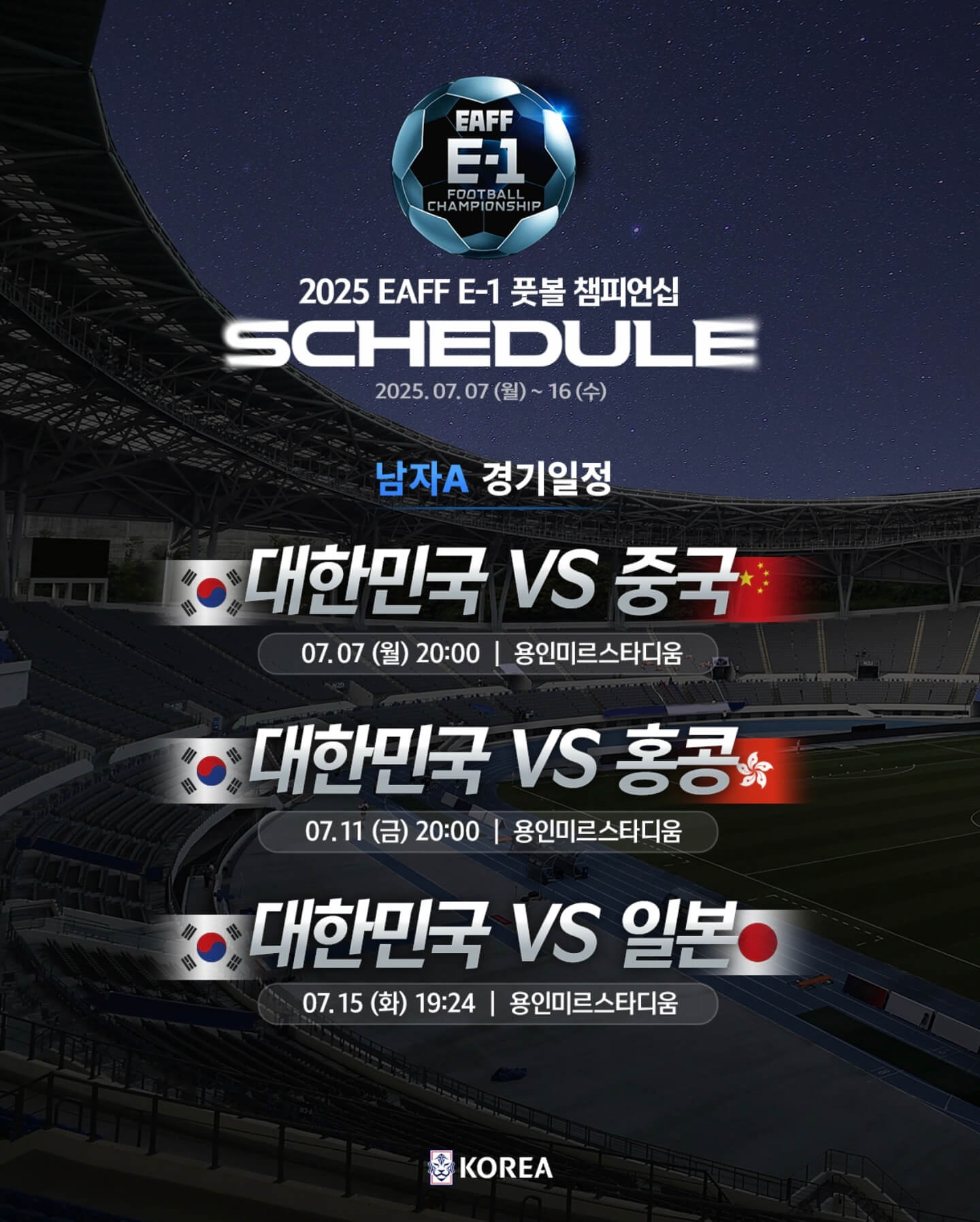 eaff e-1 챔피언십 남자부는 한국 축구팬들에게 더 큰 관심을 받고 있는 만큼 전 경기 저녁 프라임 시간대에 편성이 되었는데요~ 모두 용인 미르스타디움에서 치러지며 티켓도 매진되었습니다.