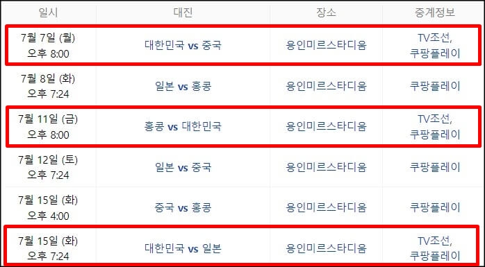 첫 경기는 7월 7일(월) 오후 8시 한국 vs 중국 / 두 번째 경기는 7월 11일 오후 8시 한국 vs 홍콩 / 마지막 경기는 7월 15일(화) 오후 7시 24분 한국 vs 일본 순으로 경기가 진행되며 남자부의 모든 축구 중계는 앞서 얘기했듯이 tv 조선과 쿠팡 플레이를 통해 생중계됩니다.