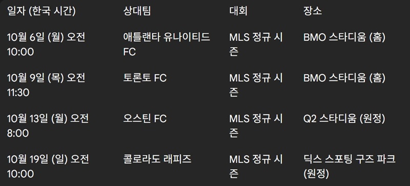 손흥민 선수가 lafc에 합류한 2025년 하반기 MLS 정규 시즌의 막바지이자 플레이오프 진출을 위한 중요한 시기입니다. 그리고 팬들은 그의 합류로 더욱 치열해진 lafc 경기일정을 주목하고 있습니다. 위의 lafc 경기일정은 현지 사정에 따라 변경될 수 있으며 플레이오프 진출 시 10월 말부터 12월까지 추가 경기가 진행될 예정입니다.